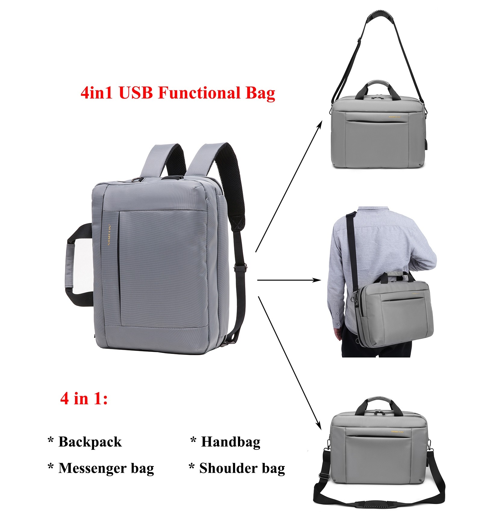 *4in1 USB functional bag: handbag,backpack,messenger bag or shoulder bag